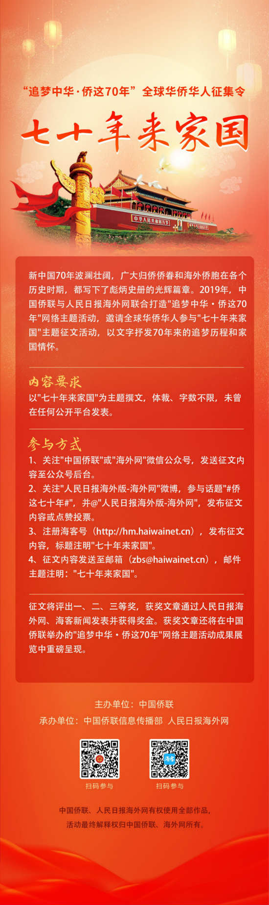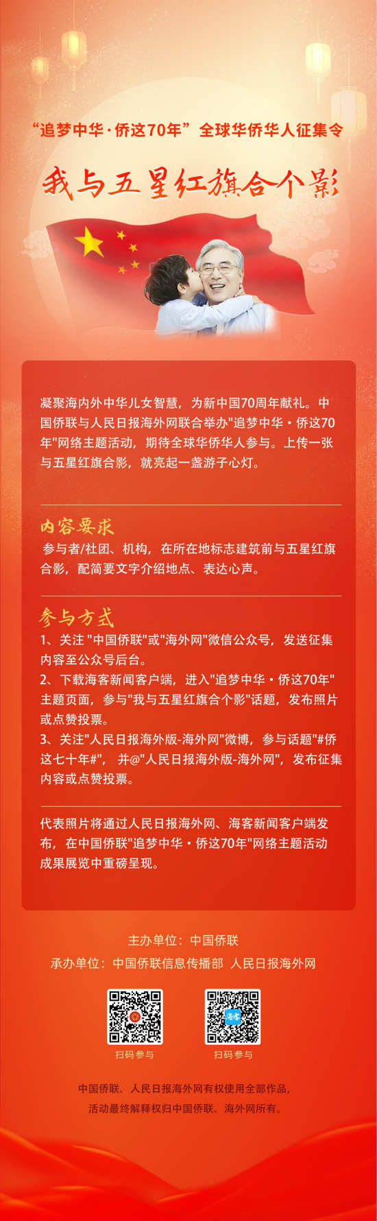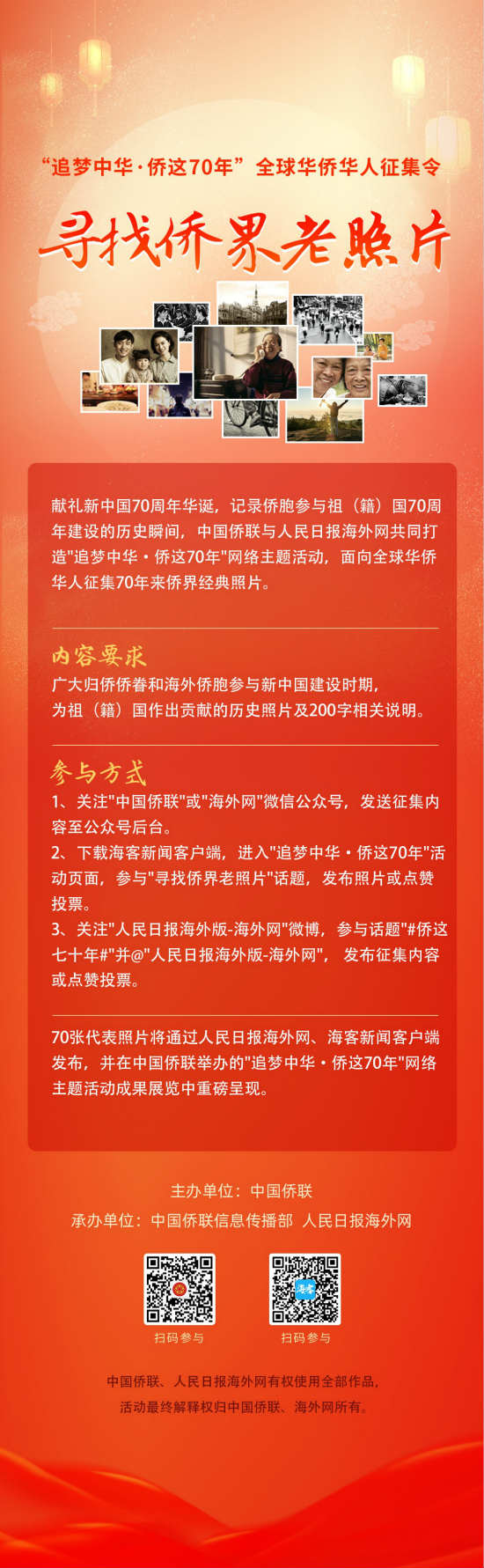 身处媒体融合新时代,汇聚分布世界各地的侨胞声音,离不开融媒体技术支持。此次活动中,中国侨联牵手人民日报海外网,在移动端发力。参与者可通过下载海客新闻客户端,或关注“人民日报海外版-海外网”微博、“海外网”微信公众号,参与话题“#侨与新中国#”、“#寻找侨界老照片#”、“70年来家国”等话题,上传新中国70年来在经济、科技、文体等领域作出特殊贡献的侨界人物故事,重要历史节点的侨界老照片,以及70年来家国传承的各种故事。