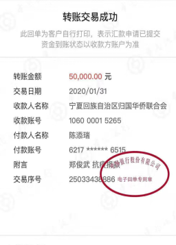 疫情就是命令,防控就是责任。宁夏侨联严格落实党中央和自治区党委关于疫情防控的决策部署,认真做好疫情防控相关工作,及时发出“关于为打赢疫情防控阻击战贡献力量的倡议书”,海内外侨胞积极响应、捐款捐物,贡献侨界爱心和力量。 宁夏政协常委、宁夏侨联副主席??∥湎壬?,宁夏侨联常委陈添瑞先生,在看到倡议书的当天,分别捐赠5万元现金,用于宁夏新型冠状病毒感染的肺炎疫情防控。作为香港宁夏同乡会副会长,??∥湎壬て谝岳慈刃墓娲壬剖乱?,为促进宁港澳三地交流做出了积极贡献。
