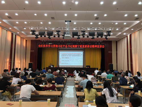 为认真学习贯彻习近平总书记视察宁夏重要讲话精神, 8月6日下午,宁夏侨联举办“全区侨界学习贯彻习近平总书记视察宁夏重要讲话精神宣讲报告会”。邀请宁夏党委统战部副部长柴建国作了题为《深入学习贯彻习近平总书记视察宁夏重要讲话精神》的专题宣讲。来自全区各条战线的归侨侨眷和侨资企业代表,各市(县、区)、高校侨联和社区“侨胞之家”干部职工,宁夏侨联七届委员会委员及宁夏侨联全 体干部职工共120多人参加学习,宁夏侨联副主席郑大鹏主持宣讲会。