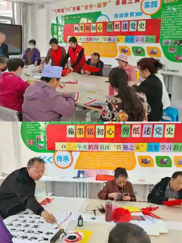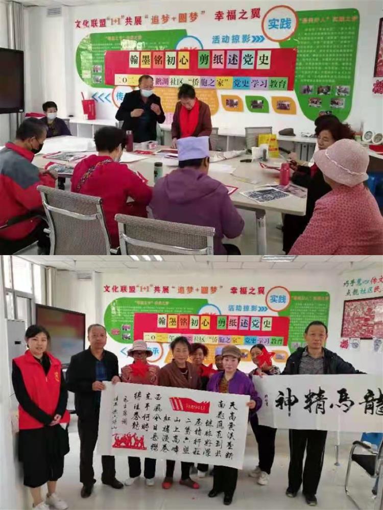 党史学习教育开展以来,全区各级侨联组织和各基层阵地周密安排、创新 落实,党史学习认真扎实,专题宣讲全面铺开,办好实事同步推进,学习氛围 日渐浓厚。为歌颂党的光辉历程和丰功伟绩,5月7日下午,贺兰县天鹅湖社区 邀请银川市级非物质文化民间剪纸传承人吴素梅、社区书法爱好传播使者袁瑜 品与“侨胞之家”广大侨界群众和志愿者共同开展“翰墨铭初心 剪纸述党史”活动。通过讲述党史故事,用书法和剪纸相融合的艺术形式,以一幅幅作品颂党恩,念党情,抒发爱党爱国情怀,推动党史学习教育走深走实,走进侨界群众。 “八十五年前,中国工农红军第一、二、四方面军,经过艰苦卓绝的万里 长征,在会宁和将台堡顺利会师,宣告长征胜利结束。”吴老师一边介绍一边 用铅笔轻轻地勾勒出宁夏红色历史记忆,只见小剪刀在吴老师灵巧的手中上下 翻飞,红色纸片不断飞舞旋转,历时1个小时的创作,一幅“长征精神永放光芒 的将台堡会师”剪纸作品闪着熠熠光辉映入眼帘。方寸之间,情意满满,一张 薄薄的红纸,一份浓浓的情怀,表达着侨界群众对党的祝福和忠诚、热爱与 感恩之情。在吴老师的指导下,侨界群众和志愿者们踊跃动手学习裁剪代表 红色党史故事的图案。侨眷刘俊敏阿姨一边欣赏自己的剪纸作品,一边激动 的说:“此次活动,将传承非遗文化与党史学习教育结合起来,让党史学习教 育更加鲜活、接地气。”