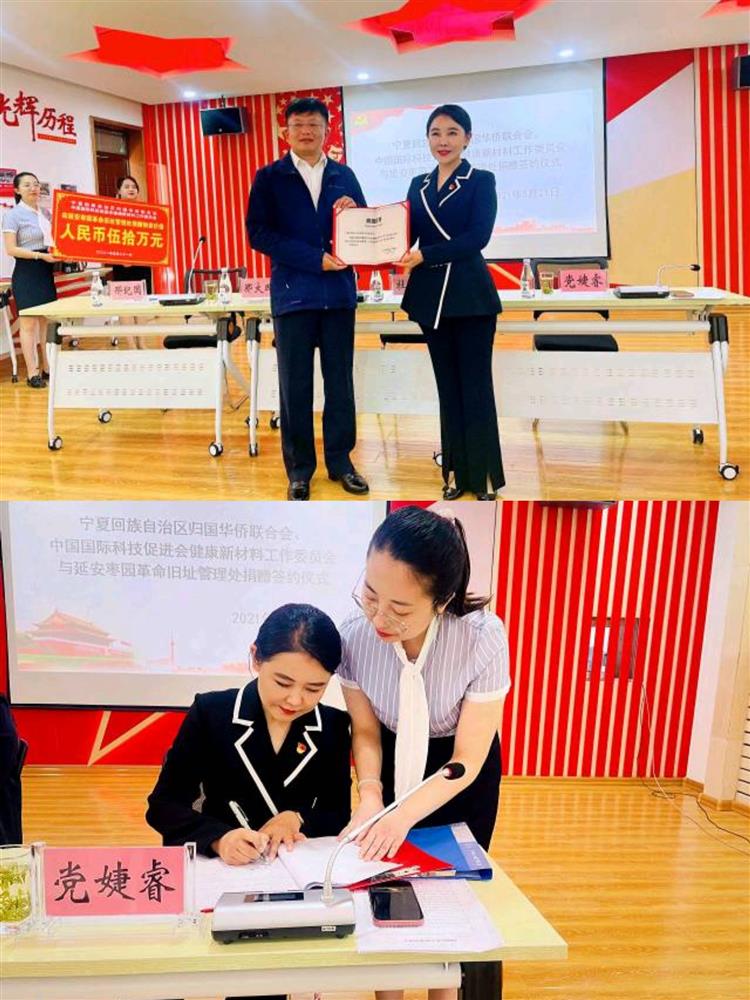 5月21日上午,宁夏侨联与延安枣园革命旧址管理处在延安市举行联学共建暨捐赠签约 仪式,联合中国国际科技促进会健康新材料工作委员会为延安枣园革命旧址捐赠价值五十万 元的物资。宁夏侨联副主席郑大鹏、延安革命纪念地管理局副局长、市文物局局长杜芳华出 席签约捐赠仪式,宁夏侨界红色主题教育培训班全体学员和延安枣园革命旧址管理处干部职 工共70余人参加。