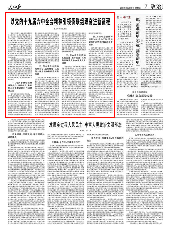 | 党的十九届六中全会是在重要历史关头召开的一次具有里程碑意义的大会。习近平总书记发表了重要讲话,会议审议通过了《中共中央关于党的百年奋斗重大成就和历史经验的决议》?!毒鲆椤吠怀銮康鞯?ldquo;两个确立”是党的十八大以来最重要的政治成果,《决议》提出的“十个明确”进一步概括了习近平新时代中国特色社会主义思想的核心内容,会议系统总结了党带领人民创造的伟大成就和十个方面的经验,发出了以史为鉴、开创未来,奋斗新时代、奋进新征程的动员令,在海内外侨界引发热烈反响和强烈共鸣。 侨联是党和政府联系广大归侨侨眷和海外侨胞的桥梁和纽带,我们共同组成了一个温暖的大家庭。新征程上,要把深入学习贯彻党的十九届六中全会精神作为重大政治任务,增强“四个意识”、坚定“四个自信”、坚决做到“两个维护”,把归侨侨眷和海外侨胞紧密团结起来,把归侨侨眷和海外侨胞的优势发挥出来,以党的百年历史决议为引领,强化担当作为,切实履行职能,跟着党走好新的赶考之路,共创民族复兴的美好未来。 一、用六中全会精神凝聚侨心、增进共识,激发侨心向党奋进新时代的磅礴力量 百年征程壮阔,百年赤子情深。一百年来,党始终践行初心使命,团结带领全国各族人民绘就了人类发展史上的壮美画卷,中华民族伟大复兴展现出前所未有的光明前景。中国共产党带领广大中华儿女,走上了不可逆转的中华民族伟大复兴的历史进程,而这也正是广大侨胞共同的梦想和不懈的追求。侨联组织要以习近平新时代中国特色社会主义思想为指导,深入学习贯彻十九届六中全会精神,加强侨界思想政治引领,引导侨界群众深刻理解和把握全会精神的核心要义、精神实质,自觉把思想和行动统一到党中央重大决策部署上来,不断增强“四个意识”、坚定“四个自信”、做到“两个维护”,使广大归侨侨眷和海外侨胞深刻认识到确立习近平同志党中央的核心、全党的核心地位,是时代呼唤、历史选择、民心所向。深刻认识到党的十八大以来党和国家事业取得的十三个方面历史性成就、发生的历史性变革。深刻认识到中国共产党为什么能、马克思主义为什么行、中国特色社会主义为什么好。深刻认识到只有社会主义才能救中国,只有社会主义才能发展中国。深刻认识到坚持党的领导、坚持独立自主、坚持中国道路的重要历史意义和现实意义。把学习全会精神激发出的侨界热情,切实转化为侨心向党奋进新时代的磅礴力量。 二、用六中全会精神砥砺初心、践行使命,弘扬伟大建党精神和侨界光荣传统 历史川流不息,精神代代相传。一百年前,中国共产党的先驱们创建了中国共产党,形成了伟大建党精神?;赝倌?,精神火炬始终熊熊燃烧,照亮充满艰辛的奋斗征程。在中国共产党建党初期的峥嵘岁月中,在星火燎原、艰苦卓绝的奋斗历程中,在寻求民族复兴、国家富强的发展历程中,广大侨胞功不可没。从“万里投荒、一身是胆”的杨明斋,到品味真理味道、翻译《共产党宣言》的陈望道;从大革命时期就积极入党的大批华侨,到自愿回国参加抗战的南侨机工;从组织华侨抗日救亡、亲赴延安考察的陈嘉庚,到毅然放弃国外优越的生活、回国参加社会主义建设的钱学森等海归科学家;从“一带一路”的参与者到人类命运共同体的践行者……一个个闪亮的名字镌刻在中华民族伟大复兴的征程上。作为中国共产党的忠实拥护者和坚定追随者,一代代归侨侨眷和海外侨胞情系桑梓、矢志报国,与全体中国人民一起,共同书写了中华民族几千年历史上最恢宏的史诗。侨联组织要深入开展党史学习教育,深化“创业中华”“亲情中华”“追梦中华”“侨连五洲”等品牌工作,引领侨界群众弘扬爱国爱乡,心系桑梓、心系祖国的侨界光荣传统,坚定不移听党话、跟党走,成为爱国精神的传承者、中华优秀传统文化的传播者、构建人类命运共同体的践行者、祖国完全统一的促进者,为实现第二个百年奋斗目标提供坚强思想保证和强大精神力量。 三、用六中全会精神汇集力量、携手共进,巩固和发展海内外中华儿女大团结 百年赤子心,悠悠桑梓情?;赝倌攴芏防?,团结统一的中华民族是海内外中华儿女共同的根,博大精深的中华文化是海内外中华儿女共同的魂,实现中华民族伟大复兴是海内外中华儿女共同的梦。为了实现中华民族伟大复兴,百年来,中华儿女同舟共济、携手前行,谱写下一曲曲大团结大联合的壮丽篇章。中华文明源远流长,中华文化博大精深,中华民族勤劳、智慧、勇敢、友善,中华美德代代相传。侨联组织要紧紧围绕习近平总书记提出的“凝聚侨心侨力同圆共享中国梦”的新时代侨务工作主题,把握新时代侨务工作主线,鼓励引导世界各地的广大华侨华人发扬中华民族光荣传统,遵守当地法律和习俗,既要自己生活好、工作好、家庭幸福,又要积极融入和回馈当地社会,厚植中外友好的民间基础。注重涵养侨界资源,团结引导海外侨社侨团之间加强交流、增进理解、深化合作,相互支持、相互帮助、相互欣赏,更好服务侨胞,促进华人社会和谐发展。以实际行动不断巩固和发展全体中华儿女大团结,铸牢中华民族共同体意识,形成海内外全体中华儿女心往一处想、劲往一处使的生动局面,汇聚起实现中华民族伟大复兴的磅礴伟力。 四、用六中全会精神指引