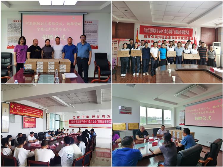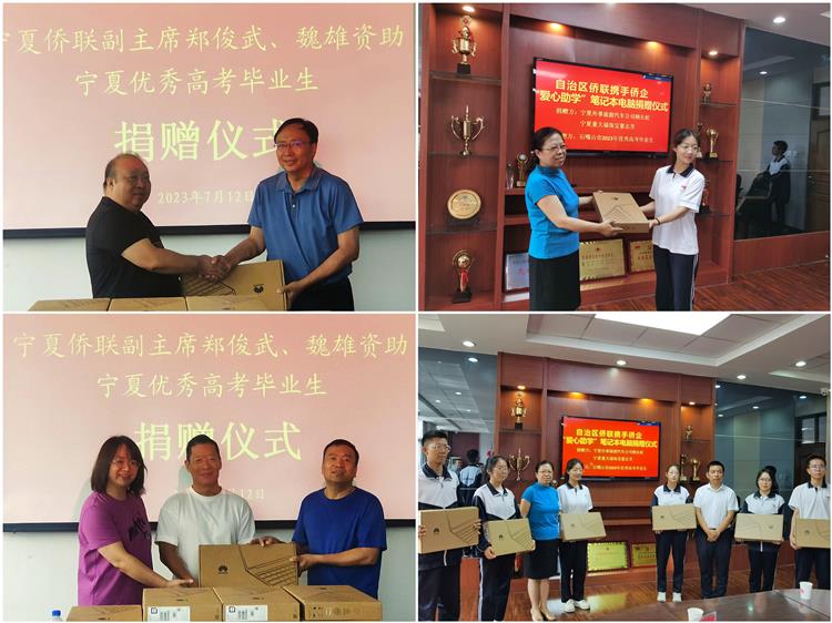 为深入学习贯彻习近平总书记关于侨务工作重要论述,扎实推进习近平新时代中国特色社会主义思想深化、内化、转化,用心用情用力为民服务,推动主题教育走深走实。7月以来,随着高考录取的展开,宁夏侨联携手爱心侨企启动2023年“侨爱心助学”捐赠活动。 中国侨联副主席、宁夏侨联主席、银帝集团董事局主席朱奕龙,宁夏侨联副主席、豹王滤芯制造有限公司执行董事郑俊武,宁夏侨联副主席、澳门友盈集团行政总裁魏雄,宁夏侨联副主席、宁夏华祺实业集团董事长何学虎,宁夏侨联常委、宁夏外事旅游汽车有限公司总经理顾长虹,石嘴山市侨联主席、宁夏董大福珠宝总经理董志芳6位侨资企业家为此次活动鼎力支持,分别向宁夏育才中学、固原一中和石嘴山三中的家庭困难优秀高考毕业生捐赠价值21万元的笔记本电脑42台。