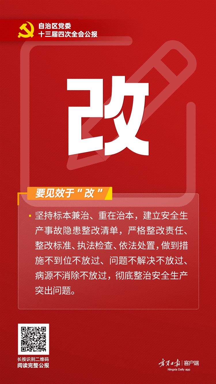 | | | 自治区党委十三届四次全会精神“一字一意”③|要见效于“改” | | | | 来源:宁夏日报客户端 发布时间:2023-08-17 | 【编者按】7月26日至27日,自治区党委十三届四次全会在银川举行。此次全会是自治区成立以来第一次以安全生产为主题的党委全会。即日起,宁夏日报客户端推出“系列海报”全会精神“一字一意”,带您一起深入学习此次全会的主要精神。自治区党委十三届四次全会指出:坚持人民至上、生命至上,坚持预防为主、源头防范,坚持系统观念、综合治理,坚持深化改革、强化法治,坚持各负其责、齐抓共管。 按照“所有事”全领域覆盖、“一件事”全链条管控、“落实事”全过程监管,坚决打好安全生产主动仗、总体仗、攻坚仗、作风仗,以治本之举、长远之策护佑百姓安宁安康、保障宁夏长治久安。