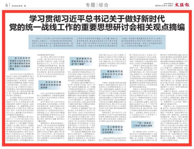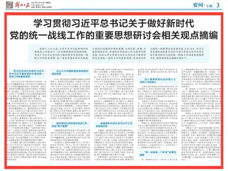 8月25日,解放日报、文汇报刊登《学习贯彻习近平总书记关于做好新时代党的统一战线工作的重要思想研讨会相关观点摘编》。全文如下: