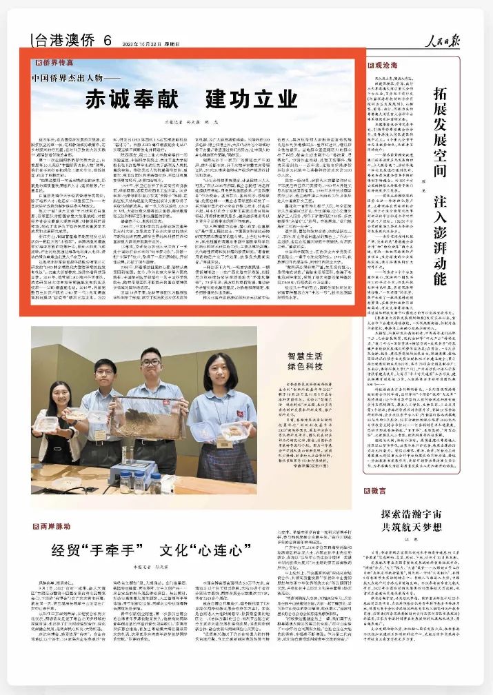 | 10月22日出版的《人民日报》刊发题为《中国侨界杰出人物——赤诚奉献 建功立业》文章,全文如下。 近些年来,在我国经济发展的主战场,在脱贫攻坚的第一线,在科教领域的最前沿,在乡村振兴的行列里,在对外开放的火热实践中,都活跃着侨胞的身影。 第十一次全国归侨侨眷代表大会上,白重恩等10人荣获“中国侨界杰出人物”称号,他们在不同行业和岗位上建功立业、报效祖国,作出了积极贡献。 “如果说要用一句话来描述我的追求,那就是为高质量发展培养人才,建言献策。”白重恩说。 白重恩是清华大学经济管理学院院长,除了培养人才,他还有一项重要工作——为国家经济政策的制定提供参考与建议。 致力于做“顶天立地”学术研究的白重恩,带领团队对接国家重大发展战略、对接经济社会发展重大现实问题、对接国际前沿领域,形成了诸多关于经济发展的重要学术成果和政策研究成果。 浙江舟山,我国首座海洋潮流能发电站状如一把巨大的“小提琴”。奔腾湍急的潮流穿过海中布放的密集叶片,推动水轮机飞速旋转,产生的电流通过海岛电站并入电网,清洁的绿色电能由此进入千家万户。 这是杭州林东新能源科技股份有限公司研发的“LHD林东??榛笮秃Q蟪绷髂芊⒌缁?rdquo;。加拿大侨眷林东,始终怀着科技强国梦。2009年,他带领LHD海归科研团队,成功研发出大功率海洋潮流能发电机组系统群——LHD潮流能电站。2016年,具备完整自主知识产权的LHD第一代1兆瓦潮流能机组模块“侨联号”顺利下海发电。2022年,研发出LHD第四代1.6兆瓦潮流能机组“奋进号”。目前,LHD海洋潮流能发电站已实现连续不间断发电并网运行。 陕西西安,西北工业大学航空楼的一间实验室里,中国科学院院士、西北工业大学副校长张卫红指导学生进行关于新型无人机机翼的实验。传统的无人机机翼结构复杂、重量大,张卫红团队利用新型材料,不但让机翼变得更加轻巧,还更加智能化。 1999年,张卫红放弃了法国高校终身教职,举家回国,返回母校西北工业大学。20多年来,他带领团队努力攻克“卡脖子”难题,在航空航天结构轻量化高性能设计方面取得了系统性创新成果。新一代大型运输机、C919大飞机、大型运载火箭等国之重器,都承载着张卫红和科研团队科技强国的梦想。 拳拳赤子心,殷殷报国志。 2008年,中国科学院院士李述汤受邀来到苏州大学,主导成立了苏州大学功能纳米与软物质研究院,瞄准世界纳米科技前沿和国家重大需求开展集中攻关。 15年来,李述汤为苏州大学培养了一支处于国际前沿水平的“纳米梦之队”,突破一批“卡脖子”技术,取得了一系列原创性、开创性成果,打破了国外垄断。 2005年,怀着报效祖国的心愿,陆林从美国回到祖国。如今,作为北京大学第六医院院长、中国精神医学领域唯一的中国科学院院士,陆林带领团队不断提升我国在精神医学领域的国际话语权。 回国10多年来,陆林带领团队为睡眠医学科制定了标准,建立了规范的诊疗体系和培训机制,为广大病患减轻痛苦。他培养的100多名硕、博士和博士后,大多已成为这个领域的骨干力量。“希望通过我们的努力,让中国人的身心健康更有保障。”陆林说。 湖南长沙市一家工厂的智能生产车间里,体外诊断专家、分子生物学家戴立忠带领团队,对PCR??橹悄苌叩牟芙刑致酆透慕?。 “让生命科技更有温度,让基因技术人人可及。”自从2008年归国,戴立忠就把“为老百姓提供用得起、用得好的基因技术、产品和服务”作为使命?;蛐酒?、基因测序、核酸质谱、免疫检测……戴立忠带领团队研发了一系列填补国内行业空白的核心技术,过去用不起、用不好的分子诊断正在变成老百姓用得起、用得好的惠民服务,越来越多患者得以享受分子诊断带来的便利与实惠。 “以人民健康为己任,潜心药学,注重原创”是中国工程院院士、中国医学科学院药物研究院院长蒋建东的座右铭。上世纪90年代末,学成归国的蒋建东来到中国医学科学院医药生物技术研究所工作,主要从事抗病毒、抗代谢性疾病和抗肿瘤的新药研究。“患者使用药物后产生了好效果,这是我的最高荣誉。”蒋建东说。 一杯凉茶下火气、一轮家访察民情、一顿便饭增情谊……在广西北海市侨港镇,归侨吴方权被街坊邻居亲切地称为“侨港和事佬”。20多年来,吴方权扎根侨港镇,推动涉侨矛盾纠纷化解在基层,为侨港和谐稳定、服务归侨渔民作出贡献。 作为北海市侨港涉侨纠纷多元化解中心负责人,吴方权带领大家把普法宣传的触角延伸到侨港镇码头、渔市和社区,增强群众法治意识。当地群众甚至辖区外的群众有了纠纷,都会主动来到中心“喝凉茶、寻帮助”。协调作业难题、处理工伤事件、解决买卖纠纷……近年来,北海市侨港涉侨纠纷多元化解中心共接待咨询及来访3000余人次。 国家一级演员、演播艺术家瞿弦和出生于印度尼西亚苏门答腊岛,1950年9月随父母从新加坡回到祖国。1965年从中央戏剧学院毕业后,他主动申请去大西北工作,8年后进入中国煤矿文工团。 瞿弦和一直坚持扎根于人民,与全团演职人员踏遍百里矿山、千里煤海,全心全意为煤矿工人服务,每年下矿慰问近200场,多次被授予“名誉矿工”称号。在他看来,“我们就是矿工们的一分子”。 退休后,瞿弦和发挥余热,依然活跃在工厂、农村、矿山等慰问基层的舞台上。“