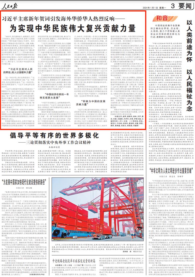 | 1月1日出版的《人民日报》刊发题为《习近平主席新年贺词引发海外华侨华人热烈反响——为实现中华民族伟大复兴贡献力量》文章,全文如下。 “2023年,我们接续奋斗、砥砺前行,经历了风雨洗礼,看到了美丽风景,取得了沉甸甸的收获。”“明年是新中国成立75周年。我们要坚定不移推进中国式现代化,完整、准确、全面贯彻新发展理念,加快构建新发展格局,推动高质量发展,统筹好发展和安全。”新年前夕,国家主席习近平通过中央广播电视总台和互联网,发表了二〇二四年新年贺词。海外华侨华人第一时间收听收看新年贺词后纷纷对本报记者表示,习近平主席的新年贺词温暖人心,提振信心,海内外中华儿女将团结一心,携手奋斗,为实现中华民族伟大复兴贡献力量。 “这一年的步伐,我们走得很坚实。”“这一年的步伐,我们走得很有力量。”“这一年的步伐,我们走得很见神采。”“这一年的步伐,我们走得很显底气。”习近平主席这样总结2023年。 “习近平主席的新年贺词让我倍感亲切。”阿联酋中华工商总会执行会长陈中奇多年来保持着聆听习近平主席发表的新年贺词的习惯。他说,“奋斗”是多年来习近平主席发表的新年贺词的关键词。2023年,在中国共产党坚强领导下,中国经济持续回升向好,为广大海外侨胞共享中国发展红利提供了广阔天地。“新时代新征程,海外侨胞更要实干奋斗,助力中国明天更美好。” 肯尼亚中国和平统一促进会会长高玮说,过去一年,中国制造业、服务业和数字经济等领域显示出强大韧性和活力,科技创新成为推动中国经济高质量发展的重要驱动力,绿色发展理念深入民心。 英国新华联谊会会长、全英中华端午龙舟会主席杨汉新说,2023年是新冠疫情防控平稳转段后经济恢复发展的一年,中国持续深化改革开放,加大宏观调控力度,着力扩大内需、优化结构、提振信心、防范化解风险,经济回升向好,令人欣喜。 “习近平主席对人民的牵挂,给人以温暖和力量。”德国波茨坦德中文化交流协会名誉主席吴刚表示,新时代十年,中国经济总量稳居世界第二,人民安居乐业,社会繁荣稳定,“广大海外侨胞为此感到骄傲和自豪。我们坚信,在新的一年里,中国高质量发展将为世界发展与繁荣注入更多活力”。 巴西中国和平统一促进会会长王俊晓表示,2023年是全面贯彻党的二十大精神的开局之年。在中国共产党领导下,中国人民团结奋斗、创新进取,中国经济社会发展取得新的巨大成就。“未来,我们希望更多参与到中国式现代化建设中,共同推进中华民族伟大复兴。” 巴基斯坦华侨华人协会会长喇杰廉表示,在全球经济发展面临挑战的背景下,中国保持战略定力,遵循既定方针,稳健向前发展。“中国经济回升向好,高质量发展扎实推进,各方面取得的成就有目共睹。海外华侨华人将继续做好本职工作,加强与所在国民众团结协作,展现中华民族风采。” “中国不仅发展自己,也积极拥抱世界,担当大国责任。”习近平主席在新年贺词中指出,世事变迁,和平发展始终是主旋律,合作共赢始终是硬道理。 泰国开泰银行高级副总裁蔡伟才表示,展望2024年,中国市场将更加全面地对外开放,共建“一带一路”高质量发展将不断走深走实,中国与东盟市场交流互动将进一步密切。“中国经济在新的一年将实现更大发展,持续为世界经济复苏注入强劲动力。” 中欧经济文化交流协会秘书长吴忠表示,2023年,中国采取一系列扎实举措积极推进对外开放,展现了与世界各国分享发展机遇的诚意,进一步促进各国民心相通。新的一年,中国坚持高质量发展,推进高水平对外开放,将以中国式现代化为推动实现世界现代化提供新机遇。 马来西亚中国公共关系协会副会长颜天禄表示,2023年,中马双边贸易持续发展,人文交流亮点纷呈,两国往来航班持续恢复,人员往来日益频繁。2024年是中马两国建交50周年,期待两国续写构建命运共同体的新篇章,携手推进共建“一带一路”高质量发展,为改善民生福祉、促进地区和平发展作出新贡献。 陈中奇表示,阿联酋长期保持中国在西亚北非地区第二大贸易伙伴和第一大出口市场地位,双方深化贸易往来让当地华侨华人获益。2024年1月1日,阿联酋、沙特等国将成为金砖合作机制的正式成员。中东国家期待中国为促进世界和平与发展贡献更多中国智慧、中国方案,希望同中国加强务实合作、实现共同发展。 俄罗斯艺术科学院通讯院士、俄罗斯华侨文化艺术医学基金会主席孙锋表示,中国经济增长对世界其他地区有积极的溢出效应。相信在中国共产党领导下,中国的繁荣发展一定会给世界带来更大机遇。 习近平主席在新年贺词中指出,中国人民深知和平的珍贵,我们愿同国际社会一道,以人类前途为怀、以人民福祉为念,推动构建人类命运共同体,建设更加美好的世界。海外华侨华人对新一年中国的发展充满信心,表示将以习近平主席新年贺词为指引,继续推动中国和所在国的交往合作。 德国中国工商会会长栾伟表示,2024年是新中国成立75周年,中国式现代化和高质量发展将取得更大成功。“海外华侨华人一直心系中国发展。我们将继续为中德经贸往来和人文交流作出积极贡献。” 南非洲广东总商会会长黄宝烮表示,在世界百年变局加速演进的背景下,中国共产党团结带领中国人民有效应对严峻复杂的国际形势和接踵而