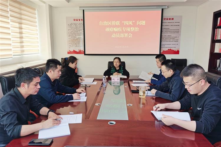 3月28日,自治区侨联召开“四风”问题顽瘴痼疾专项整治动员部署会,研究审定《自治区侨联深入开展“四风”问题顽瘴痼疾专项整治工作方案》,对专项整治工作进行动员部署,驻自治区党委统战部纪检监察组同志到会指导。