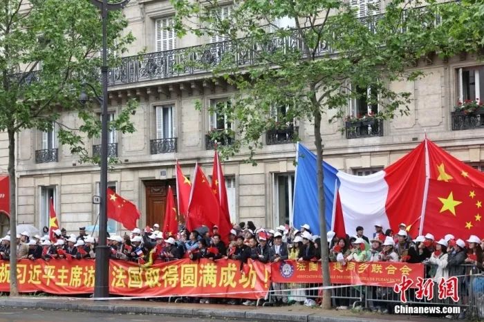 当地时间5月5日,中国国家主席习近平抵达巴黎,开始对法国进行国事访问。在巴黎街头,华人华侨和中国留学生高举“中法友谊万岁!”、“祝习近平主席访问法国取得圆满成功!”等红色横幅,挥舞中法两国国旗,热烈欢迎习近平主席到访。中新社记者 盛佳鹏 摄