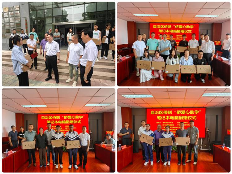 宁夏侨联主席、银帝集团董事局主席朱奕龙,宁夏侨联副主席、豹王集团总裁郑俊武,宁夏侨联副主席、澳门友盈集团行政总裁魏雄,宁夏侨联副主席、宁夏华祺实业集团董事长何学虎,宁夏侨联常委、宁夏外事旅游汽车有限公司总经理顾长虹,石嘴山市侨联主席、宁夏董大福珠宝总经理董志芳,宁夏伯利恒信汽车销售服务有限公司董事总经理汪洋,宁夏朔鼎医疗科技有限公司总经理孟阳8位侨界企业家为捐赠活动提供鼎力支持,分别向宁夏育才中学、固原二中和平罗中学的家庭困难优秀高考毕业生捐赠价值20余万元的笔记本电脑45台。