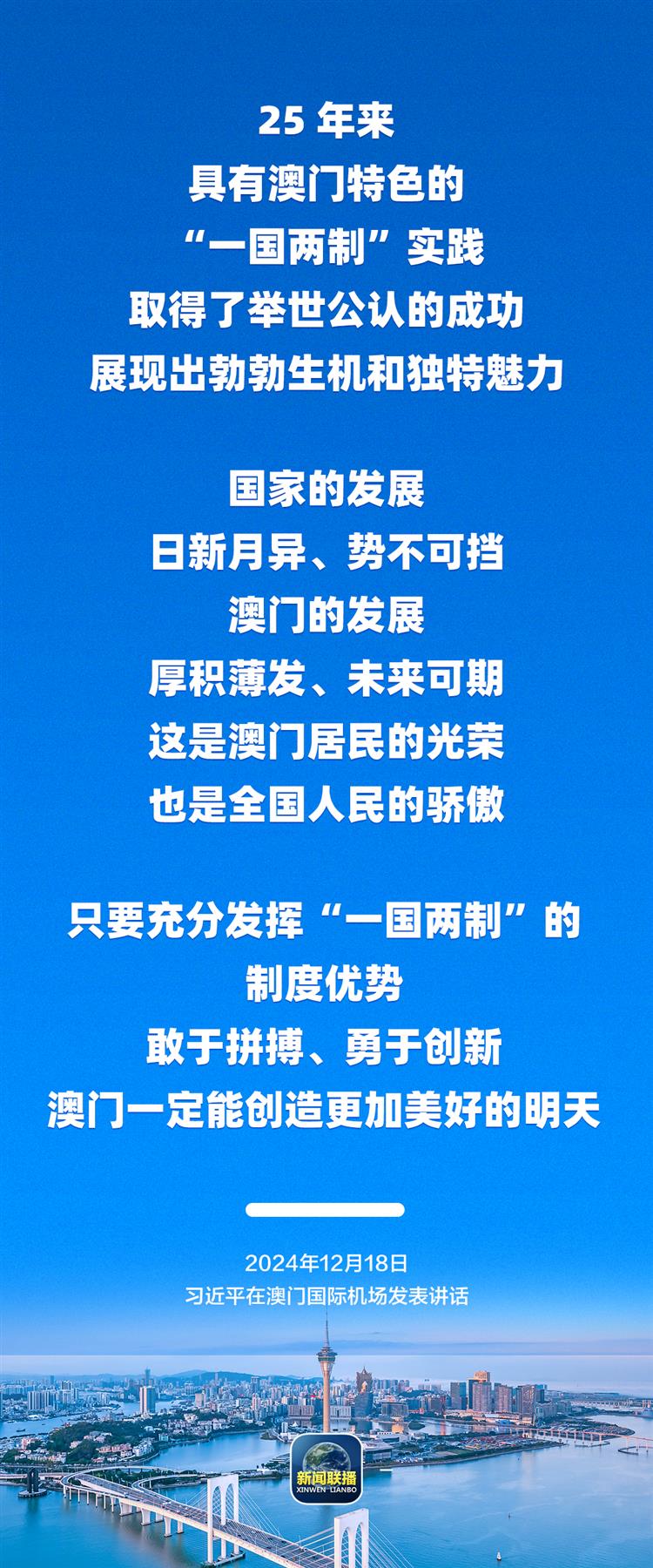 | | | 习近平抵达澳门 将出席庆祝澳门回归祖国25周年大会 | | | | 来源:新闻联播微信 发布时间:2024-12-19 | 习近平抵达澳门 澳门特别行政区行政长官贺一诚等前往机场迎接中共中央总书记、国家主席、中央军委主席习近平18日下午乘专机抵达澳门,出席将于20日举行的庆祝澳门回归祖国25周年大会暨澳门特别行政区第六届政府就职典礼并视察澳门。16时许,习近平乘坐的专机徐徐降落在澳门国际机场。习近平和夫人彭丽媛走出舱门,向欢迎人群挥手致意。澳门警察乐队奏响热情洋溢的欢迎曲,舞龙舞狮表演喜气欢腾。舷梯旁,两名少年儿童向习近平和彭丽媛献上鲜花。在澳门特别行政区行政长官贺一诚和夫人郑素贞陪同下,习近平和彭丽媛同前来迎接的人员亲切握手。数百名澳门青少年和各界群众代表挥动国旗、特别行政区区旗和鲜花,表达热烈的欢迎。习近平这次赴澳门受到海内外高度关注,中外记者在机场等候。习近平走到采访区,向在场记者问好。他表示,每次来到美丽的澳门,都感到十分高兴。这次来,是和同胞们一起庆祝澳门回归祖国25周年,看看澳门这几年的新发展新变化。他代表中央政府和全国各族人民,向全体澳门居民致以诚挚问候和良好祝愿。习近平指出,25年来,具有澳门特色的“一国两制”实践取得了举世公认的成功,展现出勃勃生机和独特魅力。国家的发展日新月异、势不可挡,澳门的发展厚积薄发、未来可期。这是澳门居民的光荣,也是全国人民的骄傲。只要充分发挥“一国两制”的制度优势,敢于拼搏、勇于创新,澳门一定能创造更加美好的明天。习近平强调,澳门是祖国的掌上明珠,我一直惦念着这里的发展和全体居民的福祉。接下来几天,我会走一走、看一看,同各界朋友广泛深入交流,共商澳门发展大计。中共中央政治局常委、中央办公厅主任蔡奇,中共中央政治局委员、全国人大常委会副委员长李鸿忠,中共中央政治局委员、中央军委副主席何卫东,中共中央政治局委员、国务院副总理何立峰,全国政协副主席兼秘书长王东峰等陪同人员同机抵达。中共中央港澳工作办公室、国务院港澳事务办公室主任夏宝龙先期抵达,并到机场迎接。全国政协副主席何厚铧,澳门特别行政区候任行政长官岑浩辉,澳门特别行政区现任行政、立法、司法机构负责人等前往机场迎接。中央政府驻澳门联络办公室主任郑新聪,外交部驻澳门特派员公署特派员刘显法,中国人民解放军驻澳门部队司令员于长江、政委林庆华等也到机场迎接。 | | 上一条:习近平总书记:携手续写更加精彩的澳门故事 下一条:习近平出席澳门特别行政区政府欢迎晚宴并发表重要讲话 |