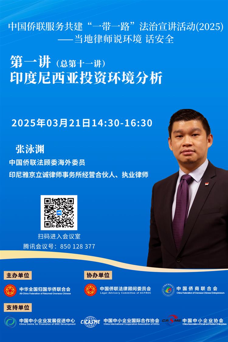 今年第一讲(总第十一讲)将于2025年3月21日(周五)14:30开播,由中国侨联法顾委海外委员印度尼西亚张泳渊律师主讲。张泳渊律师是印尼第四代华人,祖籍福建龙岩,先后毕业于印尼Azzahra大学和Pelita Harapan大学,专长为民事、刑事、能矿资源、不正当竞争及反垄断、金融、卫生、会计等,是印尼雅加达雅京立诚律师事务所经营合伙人、执业律师。2019年至2023年,张律师带领雅京立诚律所连续五年进入印尼全国 100大律所排行榜。张律师长期为在印尼的中资企业和中国公民提供法律咨询和帮助,并致力于促进印尼与中国的法学交流。张律师于2018年受聘为中国侨联法顾委海外委员,于2019年担任印尼就业法典的备案审查专家,于2021年担任印尼金属和煤炭矿业法操作细则的备案审查专家,同时担任印尼律师协会维护律师权益部副部长、印尼能矿律师协会律师维权权益部长。