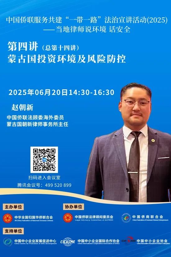 为深入学习贯彻党的二十大和二十届三中全会精神,全面落实第十一次全国归侨侨眷代表大会工作部署,围绕习近平总书记在第四次“一带一路”建设工作座谈会上的讲话精神,开展中国公民、中资机构海外风险应对法律宣传,切实为中国公民和企业在共建“一带一路”国家的安全和发展保驾护航,由中国侨联主办,中国侨联法顾委、中国侨商会协办,中国中小企业发展促进中心、中国中小企业国际合作协会、中国中小企业协会支持的“中国侨联服务共建‘一带一路’——当地律师说环境 话安全”法治宣讲活动(2025)于2025年3月21日启动?;疃沟玫饺ど塘拇罅χС帧?/span> 今年第一讲(总第十一讲)中,中国侨联法顾委海外委员印度尼西亚张泳渊律师以《印度尼西亚投资环境分析》为题进行了宣讲。今年第二讲(总第十二讲)中,中国侨联法顾委海外委员德国张志远律师以《投资德国法律实务》为题进行了宣讲。今年第三讲(总第十三讲)中,中国侨联法顾委海外委员吉尔吉斯斯坦田辉律师以《中亚国家的投资机遇与法律实务——以吉尔吉斯斯坦、乌兹别克斯坦为例》为题进行了宣讲。以上三讲回放链接参见文末。 今年第四讲(总十四讲)将于2025年6月20日(周五)14:30开播,由中国侨联法顾委海外委员蒙古国赵朝新律师主讲。赵朝新律师1991年出生于蒙古国乌兰巴托市,2013年毕业于中国暨南大学法学院,后在蒙古国国家行政管理学院进修政府法务管理,是蒙古国目前唯一一位获得律师资格证的中国公民。赵律师曾担任蒙古国中国和平统一促进会、蒙古国浙江商会和多家中资企业的法律顾问,2021年创立了蒙古国朝新律师事务所。该律所是蒙古国目前唯一一家由中国公民100%持股、具有从事蒙古国相关法律业务资格的本土律师事务所,为在蒙古国的中国公民和从事矿业、生产业、建筑业、销售业、金融业等领域的中资企业提供专业、优质的法律服务。 今年第四讲(总第十四讲)收看链接参见下方海报,敬请关注! “中国侨联服务共建‘一带一路’——当地律师说环境 话安全”法治宣讲活动于2024年3月15日首次启动,来自哈萨克斯坦、西班牙、马来西亚、南非、新加坡、新西兰、泰国、俄罗斯、墨西哥、韩国十个国家的中国侨联法顾委海外委员先后进行宣讲。回放链接参见文末。 第十一讲 中国侨联法顾委海外委员印度尼西亚张泳渊律师主讲《印度尼西亚投资环境分析》 回放链接: https://meeting.tencent.com/crm/NxPDOBWP5a 第十二讲 中国侨联法顾委海外委员德国张志远律师主讲《投资德国法律实务》 回放链接: https://meeting.tencent.com/crm/2YXb6MjR07 第十三讲 中国侨联法顾委海外委员吉尔吉斯斯坦田辉律师主讲《中亚国家的投资机遇与法律实务 ——以吉尔吉斯斯坦、乌兹别克斯坦为例》 回放链接: https://meeting.tencent.com/crm/24LdjWdme5 第一讲至第十讲回放链接: http://www.chinaql.org/GB/419631/419659/460014/index.html |