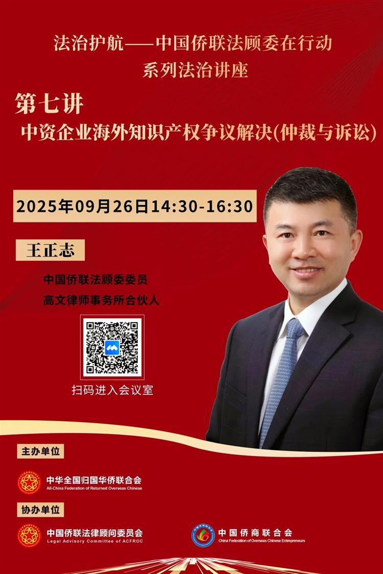 | 为深入学习贯彻党的二十大和二十届三中全会精神,全面落实第十一次全国归侨侨眷代表大会工作部署,进一步发挥中国侨联法顾委专业委员会作用,为侨胞侨企提供前置法律服务,帮助防范经营风险,由中国侨联主办,中国侨联法顾委、中国侨商会协办的“法治护航——中国侨联法顾委在行动”线上系列法治讲座于2024年4月26日正式启动。 第一讲中,中国侨联法顾委知识产权专委会主任、北京金诚同达律师事务所高级合伙人李德成律师以《企业商业秘密保护》为题进行了宣讲。第二讲中,中国侨联法顾委国际贸易与仲裁专委会秘书长、北京安杰世泽律师事务所主任詹昊律师以《中国企业海外反垄断风险应对》为题进行了宣讲。第三讲中,中国侨联法顾委行政劳动专委会秘书长、北京观韬中茂律师事务所高级合伙人吕立秋律师以《行政争议解决的重要路径-行政复议》为题进行了宣讲。第四讲中,中国侨联法顾委刑事专委会秘书长、北京大成律师事务所高级合伙人韩嘉毅律师以《企业经营过程中的刑事风险防范》为题进行了宣讲。第五讲中,中国侨联法顾委民事经济专委会副主任、北京合弘威宇律师事务所创始合伙人张巍律师以《中国律师如何为中国企业“走出去”提供法律服务》为题进行了宣讲。第六讲中,中国侨联法顾委知识产权专委会副主任、北京天驰君泰律师事务所高级合伙人马翔律师以《企业商标巨大风险及应对》为题进行了宣讲?;胤帕唇硬渭哪?/span> 第七讲将于9月26日(周五)14:30开播,由中国侨联法顾委国际贸易与仲裁专委会委员、高文律师事务所合伙人王正志律师主讲,题目是《中资企业海外知识产权争议解决(仲裁与诉讼)》。听课链接参见下方海报。