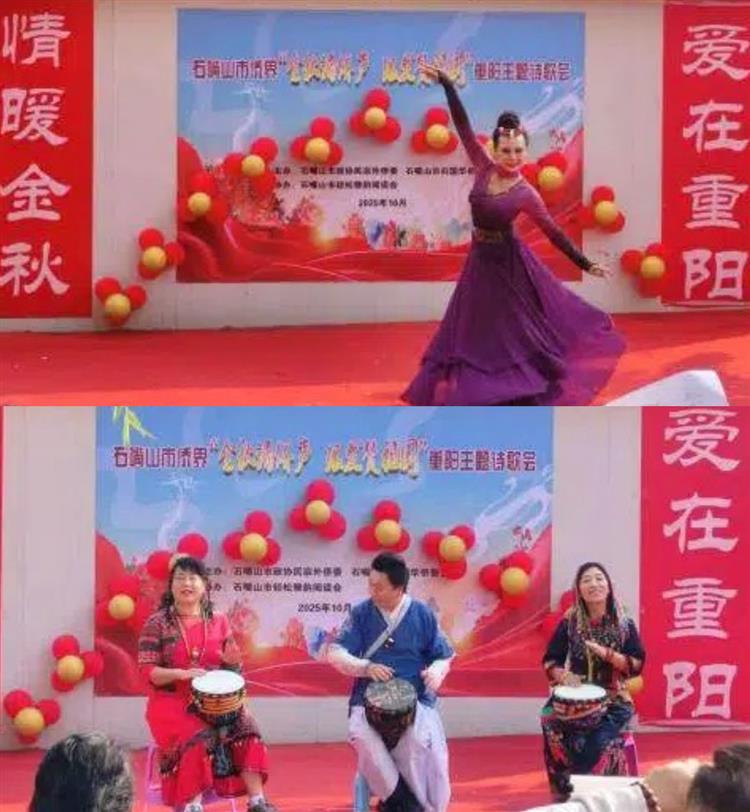 岁岁重阳,今又重阳。为弘扬中华民族尊老敬老的传统美德,凝聚侨心侨力,丰富侨界群众精神文化生活,10月15日,石嘴山市侨联联合市政协民宗外侨委,在石嘴山市杏生态园精心举办“金秋诵侨声 银发赞祖国”重阳主题诗会,归侨侨眷代表与朗诵艺术界名家雅士欢聚一堂,在秋色斑斓的银杏林间,以诗咏志、以歌颂情,共庆重阳佳节,礼赞伟大祖国。  本次活动紧扣“银发赞祖国”主题,融合朗诵、歌唱、舞蹈、器乐等多元艺术形式,展现侨界群众爱党爱国、昂扬向上的精神风貌。诗会在热情洋溢的开场合诵《穿越中国唱重阳》中拉开帷幕,铿锵有力的合诵声展现了中华儿女对重阳文化的深情传承。随后,一曲悠扬的《江山》唱响家国情怀,婉转的旋律在银杏叶翻飞的金色帷幕下,勾勒出祖国山河的壮美画卷。诗朗诵《石榴籽 中华情》以民族团结为主题,道出“各民族像石榴籽一样紧紧抱在一起”的赤子心声。在外创业的石嘴山籍企业家代表及侨眷代表也来到现场踊跃参与,以诗寄情、以文明志,表达着对家乡的深切思念与对祖国的赤诚感恩。