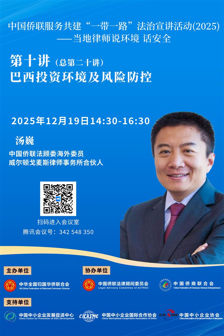 为深入学习贯彻党的二十大和二十届历次全会精神,全面落实第十一次全国归侨侨眷代表大会工作部署,围绕习近平总书记在第四次“一带一路”建设工作座谈会上的讲话精神,开展中国公民、中资机构海外风险应对法律宣传,切实为中国公民和企业在共建“一带一路”国家的安全和发展保驾护航,由中国侨联主办,中国侨联法顾委、中国侨商会协办,中国中小企业发展促进中心、中国中小企业国际合作协会、中国中小企业协会支持的“中国侨联服务共建‘一带一路’——当地律师说环境 话安全”法治宣讲活动(2025)于2025年3月21日启动?;疃沟玫饺ど塘拇罅χС帧?/span>今年第十讲(总第二十讲)将于2025年12月19日(周五)14:30开播,由中国侨联法顾委海外委员巴西汤巍律师主讲。汤巍律师毕业于巴西圣保罗大学法学院,在巴西从事律师工作二十余年,精通巴西民法、公司法、行政法,尤其在外商投资、国际贸易及基础设施建设等领域拥有深厚造诣。汤律师同时在巴西华人协会、巴西广东同乡总会等多家侨团担任重要职务,致力于为巴西当地华人华侨、中资企业及中国驻巴西使领馆提供专业法律服务。